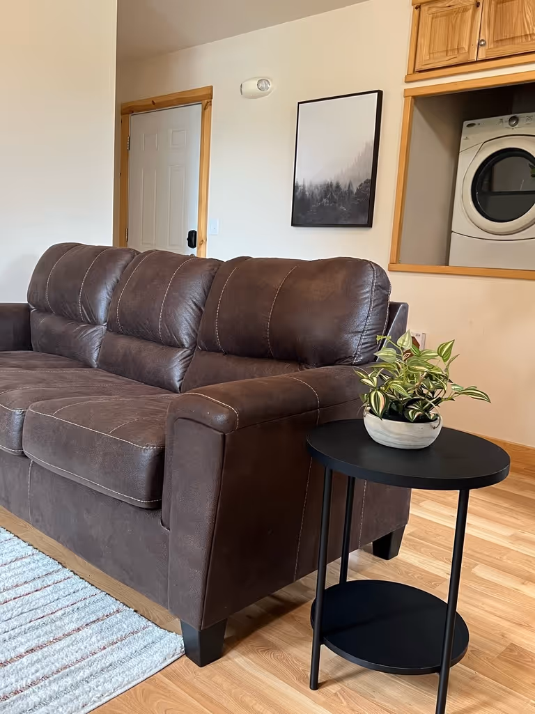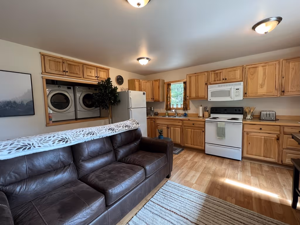 The Perch is a peaceful 1-bedroom apartment at Spruce Woods Lookout, offering mountain views, warm design, and comfort for up to four guests. Featuring a queen bed and a queen sofa bed, this unit is stocked with coffee, tea, cocoa, condiments, and everything you need in the kitchen. A washer/dryer, smart TV, and plush furnishings make this the perfect base for a relaxing stay in Seward.